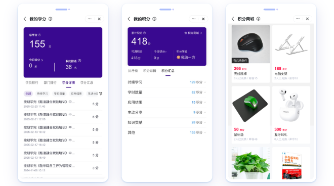 - 积分学分灵活双轨体系,支持积分兑换好礼,点燃全员学习热情